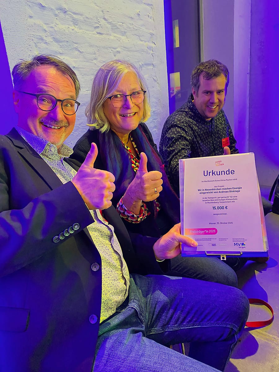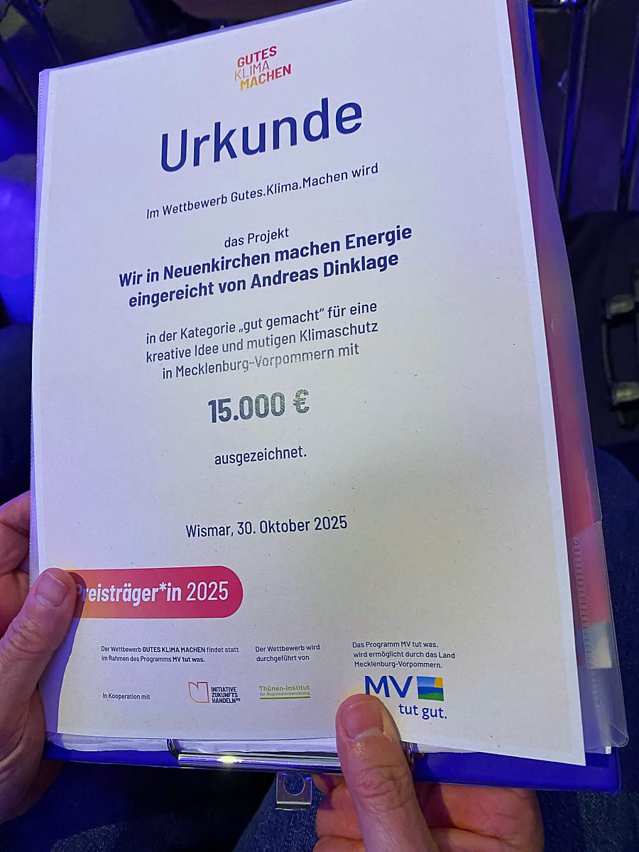 Die Preise wurden von Klimaschutzminister Dr. Till Backhaus übergeben, der besonders den genossenschaftlichen Ansatz von WiN würdigte. Neben der Preisverleihung stand der Austausch im Zentrum der Veranstaltung. In mehreren Runden hatten alle Anwesenden die Möglichkeit, sich über die anderen Projekte zu informieren. Der Stand von „Wir in Neuenkirchen“ erfreute sich regen Interesses und alle Fragen wurden gern beantwortet. Angeregt und motiviert machten sich die Neuenkirchener am Abend wieder auf den Heimweg. Das Preisgeld – so sind die Genossenschaftler überzeugt – kann gut dafür verwendet werden, die Themen Erneuerbare Energien und Klimaschutz noch intensiver in der Gemeindeöffentlichkeit zu verankern. Interessierte wenden sich gern an .