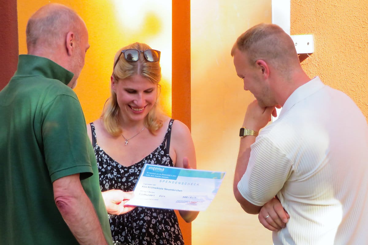 Die Photovoltaik-Spezialisten ingenia nutzten das Treffen, um Kyra Sewerin eine Spende von 500€ für die Kita zu überreichen. Ein „Sonnenglas“ soll das Prinzip der Energieerzeugung durch Sonnenstrahlen auch für die Kleinen deutlich machen, hofft Ruth Bördlein von WiN, die das Geschenk übergab.